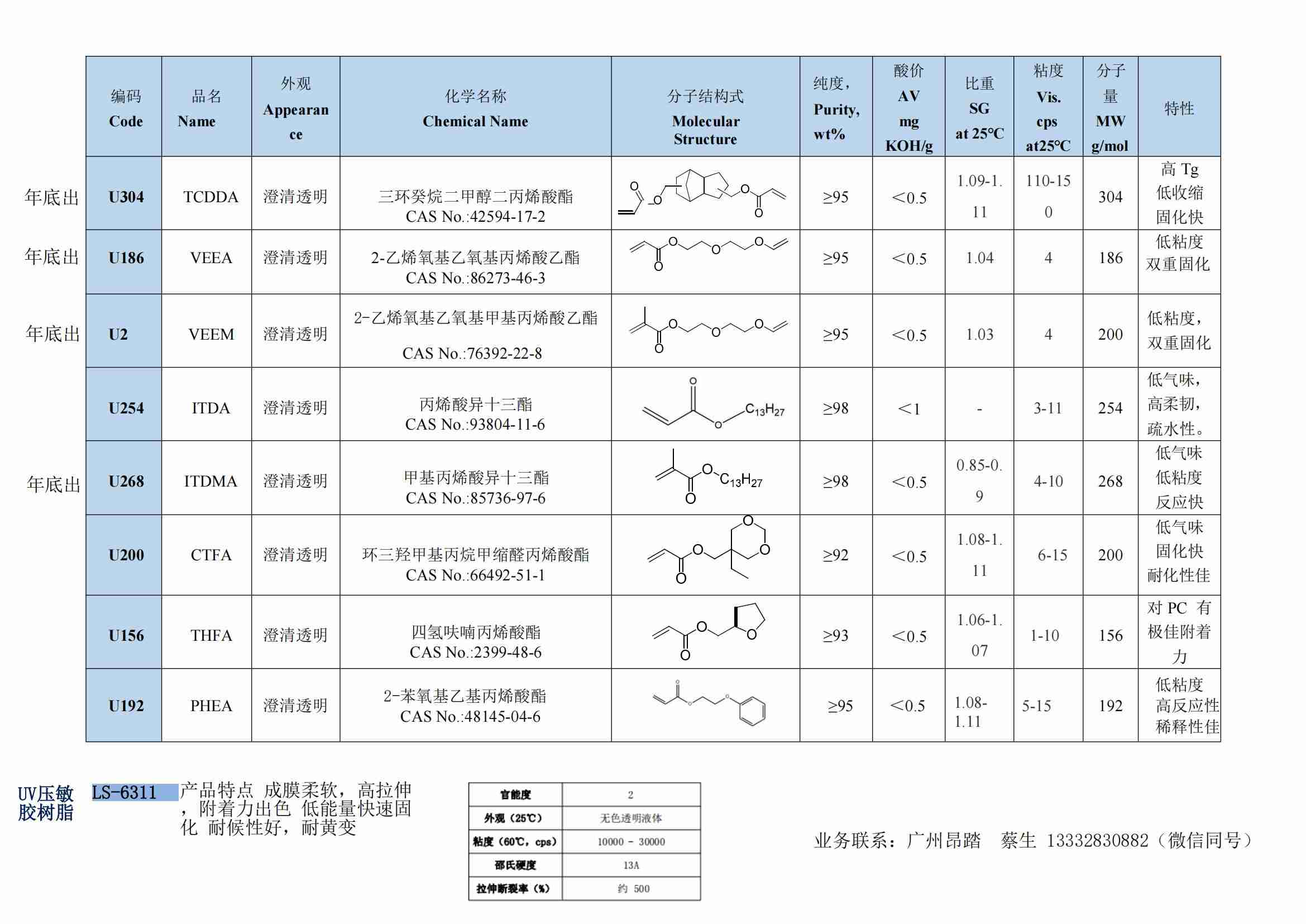 新出,国产,UV 单体, UV 压敏胶树脂, 应用与油墨,胶粘剂,涂料,3D 打印,绝缘油,UV胶带等